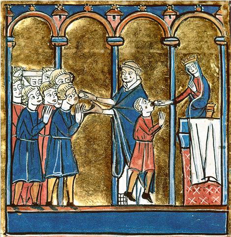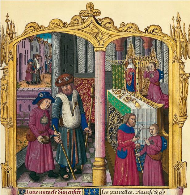 Рис. 4. Семилетний мальчик Тома, который ослеп и был вынужден нищенствовать, отправился за исцелением к мощам короля Людовика IX Святого в аббатство Сен-Дени. Он приложил кольцо к реликварию со святыми останками, а потом к глазам. Из глаз и рта пошла кровь, и он прозрел. На этой миниатюре слева другой паломник приводит его в монастырь. Оба одеты в дорожные шляпы. К ним пришиты паломнические значки — знаки тех святынь, где они побывали, и одновременно защитные амулеты. Справа мы видим, как мальчик забирается к реликварию со статуей святого монарха, а перед ней на алтаре лежат другие реликвии. Среди них — корона, в которую, как считалось, была вставлена колючка из тернового венца Иисуса, а также гвоздь, которым он был прибит ко кресту.