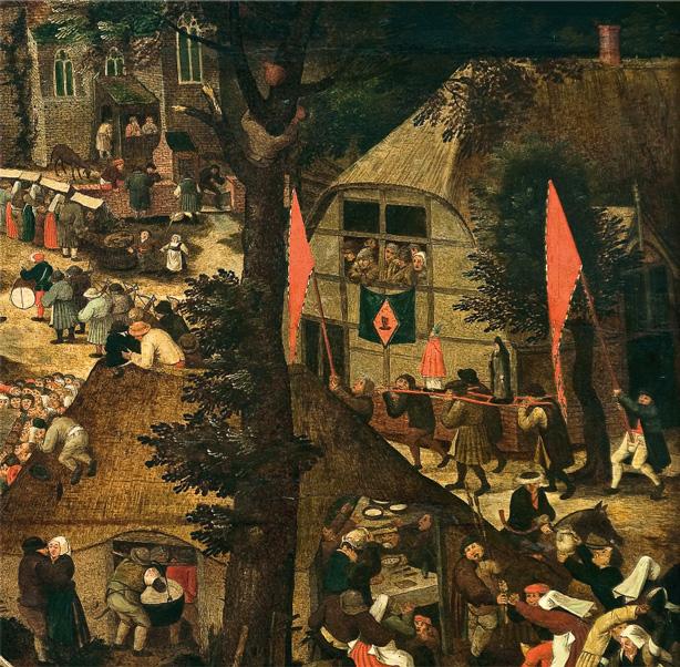 Рис. 5. Религиозная процессия посреди разгульного деревенского праздника: крестьяне несут на носилках раскрашенные статуи св. Губерта Льежского и св. Антония Великого.