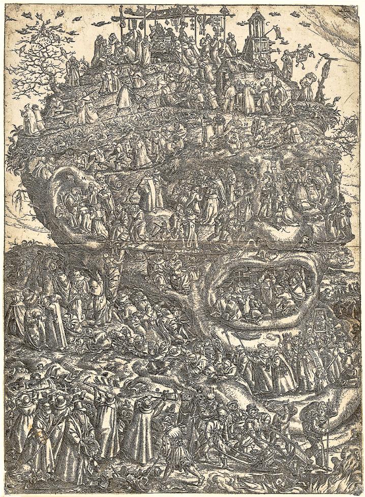 Рис. 8. Вскоре после иконоборческого восстания, вспыхнувшего в Испанских Нидерландах в 1566 г., Маркус Герардс Старший, который был убежденным кальвинистом, создал сатирическое изображение католической церкви, ее иерархии и семи таинств. Он показал «разлагающуюся» голову монаха, на которой, словно на огромной горе, копошатся десятки клириков. На макушке под балдахином восседает папа римский, окруженный грамотами индульгенций, кардинальскими шапками и епископскими митрами. Это источник его богатства — вокруг монахи несут ему мешки со звонкой монетой. Во рту чудовища священник служит мессу, а в ухе слушает исповедь. В одной глазнице епископ рукополагает священника, а в другой священник сочетает мужчину и женщину браком.
