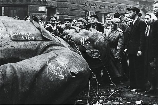 Рис. 17. В начале Венгерского восстания 1956 г. толпа в Будапеште сбросила с пьедестала восьмиметровую статую Сталина, установленную в 1951 г. в честь семидесятилетия советского вождя. На его шею набросили металлические тросы, а ноги отпилили с помощью паяльных ламп. На этой фотографии мы видим поверженного истукана, которого отволокли на одну из улиц. На щеке кто-то начертал W.C. — «туалет», а на плече — «Убийца 25 миллионов». На других фотографиях, сделанных в этот день, видно, как люди бьют статую палками. Позже голову оторвали от плеч и водрузили на нее дорожный знак. Похожие фотографии, где толпа обступает сброшенную статую диктатора, кто-то садится ему на голову или ставит ногу на его бюст, в XX в. стали символами многих революций и радикальных политических перемен. Все они подчеркивают триумф восставших над некогда всесильным правителем или режимом.