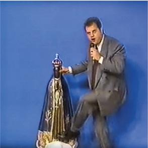 Удар по почитаемому образу почти всегда становится ударом по идентичности тех, кого он сплачивает и для кого дорог [11]. Приведу лишь один современный пример. 12 октября 1995 г. в праздник, посвященный Nossa Senhora Aparecida — статуе Девы Марии, давно ставшей национальной святыней Бразилии, протестантский телепроповедник Сержо Фон Хельдер совершил публичный иконоборческий выпад. Это произошло в эфире передачи, выходившей на телеканале евангелистов. Он принес в студию копию Nossa Senhora Aparecida и принялся ее обличать в духе ветхозаветной критики идолопоклонства: «Это просто кусок гипса, изготовленный человеческими руками… Есть ли что-то общее у Бога с подобной куклой — столь уродливой, столь отвратительной, столь убогой?.. Католическая церковь стоит на лжи… Этот образ ничего не способен сделать для вас». Придерживая статую за шею, проповедник нанес ей серию ударов руками и ногами (рис. 18). Позже он оправдывался, что хотел спасти верующих от опасности идолопоклонства, которое ведет в ад.