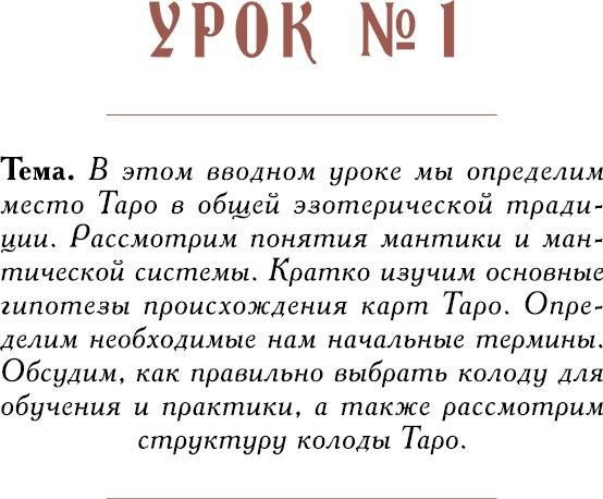 Если вы преподаватель Таро, обратите внимание на саму структуру учебника, а также на обширный комплекс упражнений, данный в конце каждого урока. Возможно, некоторые из них вы найдете полезными и включите их в свою преподавательскую деятельность. Методика этого учебника во многом напоминает подход к изучению иностранного языка. Структура упражнений и их порядок продиктованы опытом ведения групп и индивидуальных занятий по картам Таро, а также более чем десятилетним опытом лингвистического перевода и преподавания иностранного языка.