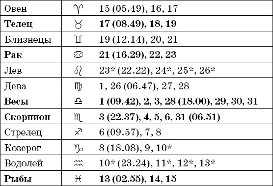 В начале каждого раздела, посвященного определенному месяцу, есть таблица, в которой приведена полная информация о состоянии Луны. Она расположена под таблицей прохождения Луны через знаки зодиака.