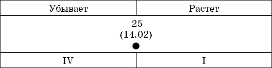 Новолуние будет 25-го, в 14 часов 2 минуты по московскому времени. Римская цифра IV в нижней строке обозначает четвертую фазу Луны (до новолуния), а цифра I – первую фазу Луны, которая всегда начинается сразу после новолуния. В верхней строке указан характер Луны (убывает до новолуния и растет после него).