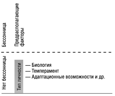 Взгляните на рисунок. Горизонтальная пунктирная линия — это условная грань, которую надо перейти, чтобы начать страдать от бессонницы. И человек, имеющий предрасположенность, относительно близок к этой грани, хотя в целом спит нормально.