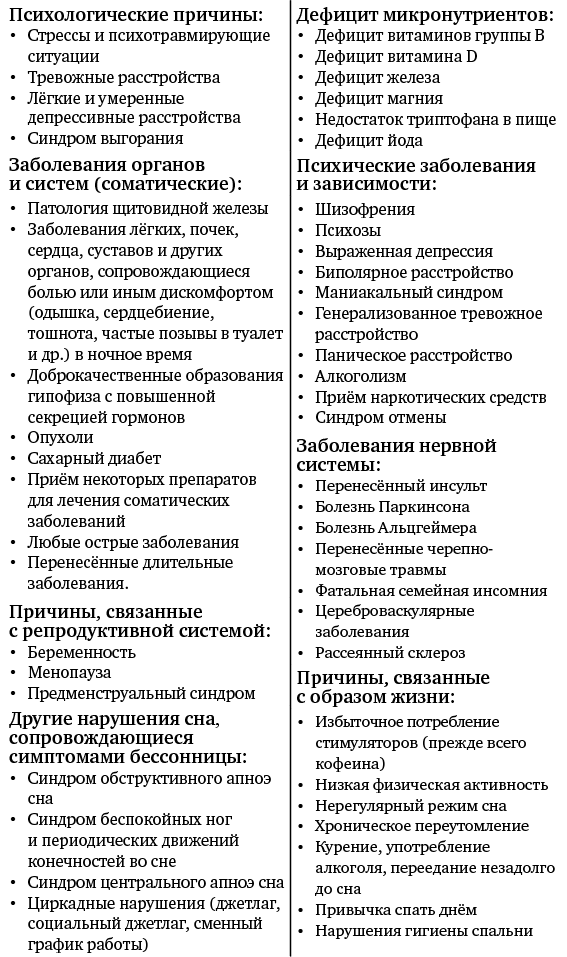 У бессонницы более сотни причин, каждую из которых можно разделить на несколько групп. На следующей странице приведена таблица причин бессонницы, составленная на основе Клинического практического руководства Американской академии медицины сна.