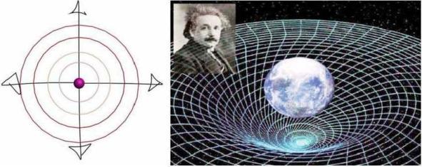 Уединённый источник гравитационного поля, т.е. один источник без окружения другими, не искривляет, а только порождает сферическое пространство-поле (фото 1, слева) вокруг него. Математика и якобы его формулы с четырёхмерным пространством-временем Минковского (четвёртая координата в метрике равна произведению скорости света на время) описывают геометрию искривления пространства на присутствие массы (энергии) в данной точке. На каком основании поставлен знак равенства между этими совершенно разными по смыслу величинами. Заметим ещё раз, что уединённый источник-масса-энергия в природе ничего не искривляет, а только излучает собственные внешние поля — гравитационные, магнитные и электрические. А вот в дополнительном поле влияния Солнца искривляет действием холодной безмассовой плазмой пространство-поле рождением силовых линий и силы притяжения. И здесь математика бессильна что то изменить в природе взаимодействия полей.