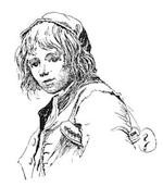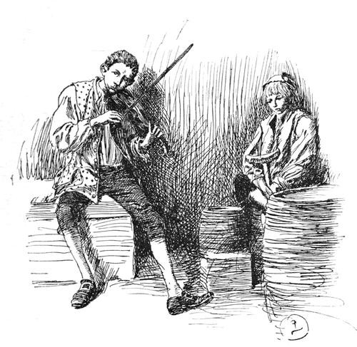 After a while he sat up, letting his foot hang down over the curb-stone, and uncoiling the longest of the treble strings, he put one end between his shining teeth, and stretched it tight by holding the other end off between his thumb and forefinger. Then, waving in the air in his other hand an imaginary bow, with his head resting a little on one side, his eyelids drooping, his mind in a state of dreamy delight, the little musician began to play—began to play the violin that he had long been working for, and hoped would some day become his own.