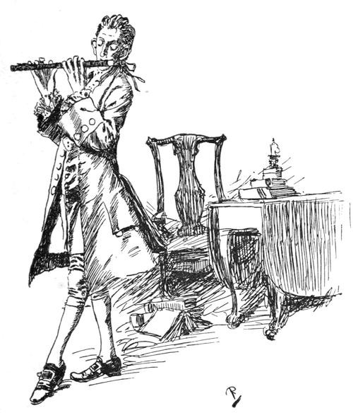 At length the parson, as if in for it, and possessed to go all lengths, jumped from his chair, laid the flute on the table, and disappeared in a hidden corner of the room. Here he kept closely locked a large brass-nailed hair trunk, over which hung a looking-glass. For ten minutes the two women waited for him to reappear, and then he did reappear, not in the same clothes, but wearing the ball dress of a Virginia gentleman of an older time, perhaps his grandfather's—knee-breeches, silk stockings, silver buckles, low shoes, laces at his wrists, laces at his throat and down his bosom. And to make the dress complete he had actually tied a blue ribbon around his long silky hair. Stepping airily and gallantly to the table, he seized the flute, and with a little wave of it through the air he began to play, and to tread the mazes of the minuet, about the room, this way and that, winding and bowing, turning and gliding, but all the time fingering and blowing for dear life.
