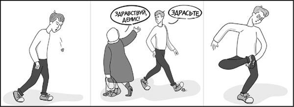 СИТУАЦИЯ 2. Герой плюет жвачку на асфальт, бабулька-соседка здоровается с ним, он отвлекается на нее и случайно наступает на свою жвачку.