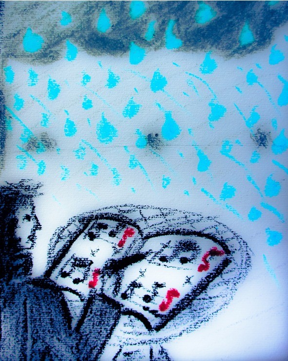 Он совершенно не заметил, как кафе наполнилось людьми. Хоть это и было не популярное место, дождь стер это понятие на какое-то время. Музыканта ничего не отвлекало, никакой шум. Он пытался выполнить свое обещание данное самому же себе. Напряженно его карандаш давил на начало поля, но так ничего и не производил. Увиденные образы крутились и перекручивались, как мясорубкой, в идею, спор с самим собой давил на голову и мешал мыслить чисто. Он стал немного раздраженнее, карандаш крутился в руках быстрее.