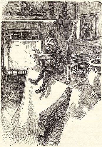 Not that he minded this; in fact, he took great pains to make the cloth as dirty as possible; and then laughing loudly, "Ho, ho, ho!" leaped on to the hearth, and began teasing the cat; squeaking like a mouse, or chirping like a cricket, or buzzing like a fly; and altogether disturbing poor Pussy's mind so much, that she went and hid herself in the farthest corner, and left him the hearth all to himself, where he lay at ease till daybreak.