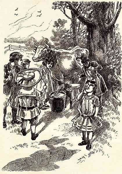 Next morning the milk was gone! Perhaps Brownie had drunk it up, anyhow nobody could say that he hadn't. As for the supper, Cook having safely laid it on the shelves of the larder, nobody touched it. And the table-cloth, which was wrapped up tidily and put in the dresser drawer, came out as clean as ever, with not a single black footmark upon it. No mischief being done, the cat and the dog both escaped beating, and Brownie played no more tricks with any body—till the next time.