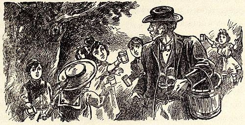 "Come on!" cried he, in his shrill voice, half like an old man's, half like a baby's. "Who'll begin to gather the cherries?"