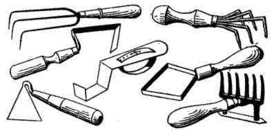 eral trucking—plows, harrows, weeder, etc.—to fit the soil for the hand tools. Much labor can be saved by using hand-wheel drills, cultivators, weeders and the other tools that have become so wonderfully popular within the past decade or two. Some typical kinds are shown in these pages. These implements are indispensable in keeping the surface soil loose and free from weeds, especially between the rows and even fairly close to the plants. In doing this they save an immense amount of labor and time, since they can be used with both hands and the muscles of the body with less exertion than the hoe and the rake require.