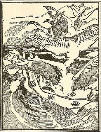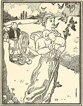 "Sirrah Stupid," she said as she set him down by his cottage gate, "better not kill at all than take the lives of poor tame creatures. I have saved your life this once, but next time you will have to suffer. Remember, it is better that two wicked wolves escape than that one kind beast be killed. We cannot afford to lose our friendly beasts, Master Stupid. We can better afford to lose a blundering fellow like you." And she drove away to her cell under the oak, leaving the silly man to think over what she had said, and to feel much ashamed.