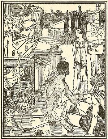 So, very respectfully, they bade him enter; and the Lord Chamberlain escorted him before the King himself, who sat on a great red-velvet throne in the Hall. In came the fellow, dragging after him by the tail the limp body of the King's wolf.