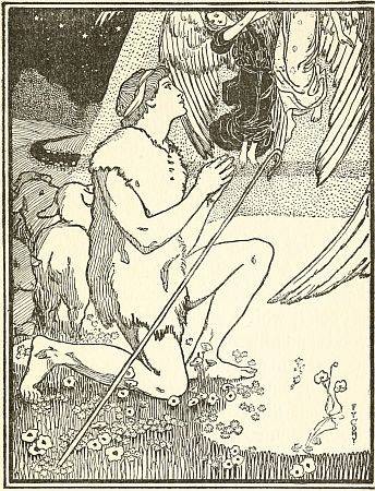 This is how it happened. The King of Ireland had a tame wolf which some hunters had caught for him when it was a wee baby. And this wolf ran around as it pleased in the King's park near the palace, and had a very good time. But one morning he got over the high wall which surrounded the park, and strayed a long distance from home, which was a foolish thing to do. For in those days wild wolves were hated and feared by the people, whose cattle they often stole; and if a man could kill a wicked wolf he thought himself a very smart fellow indeed. Moreover, the King himself had offered a prize to any man who should bring him a dead wolf. For he wanted his kingdom to be a peaceful, happy one, where the children could play in the woods all day without fear of big eyes or big teeth.