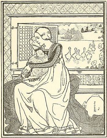 But lo and behold! as the horses galloped along over the Irish bogs of peat, Saint Bridget saw a great white shape racing towards her. At first she thought it was a dog. But no: no dog was as large as that. She soon saw that it was a wolf, with big eyes and with a red tongue lolling out of his mouth. At last he overtook the frightened horses, and with a flying leap came plump into the chariot where Bridget sat, and crouched at her feet, quietly as a dog would. He was no tame wolf, but a wild one, who had never before felt a human being's hand upon him. Yet he let Bridget pat and stroke him, and say nice things into his great ear. And he kept perfectly still by her side until the chariot rumbled up to the gate of the palace.