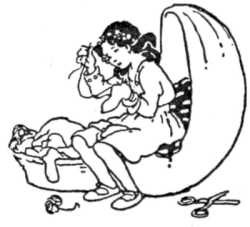 Then he turned towards Wendy, who was very busy mending the children's socks by the fireside. She looked very charming in her pretty brown frock the colour of autumn leaves, with scarlet berries in her hair, and she made Peter very happy as they exchanged thimbles and talked over the boys and their doings as if they had really been their father and mother. When the children clamoured for a dance, Peter even said that he was too old for such a game, and that his old bones would simply rattle, and Wendy also thought that the mother of such an armful could not go skipping about with her children. So Peter sang "Sally in our Alley," which song Wendy thought no one else in all the world could sing so sweetly as the darling of her heart, while the others danced pillow dances, and bolster dances, and turned somersaults on the beds, and did all the other jolly and lively things that everyone wants to do just about bedtime, when one ought to be thinking of going to sleep.