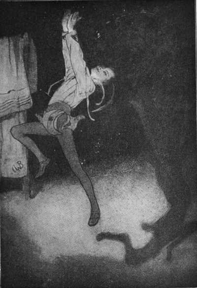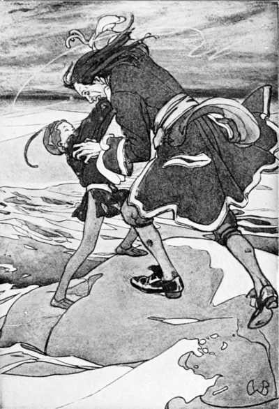 "It's the girl!" cried Hook, "there's never luck on a pirate ship with a woman aboard; let's throw her over." All the men knew that their Captain was right, and one of the Pirates started up and shook his fist at the brown-robed figure at the mast. "There's nothing can save you now, Missy," he cried. "There is one," came a ringing voice, and the brown cloak was flung aside and there stood Peter Pan. "Down, Boys, and at them," he shouted, and with a rush the Boys, armed with weapons which Peter had found and given them in the cabin, swarmed down upon the lower deck. The Pirates believed that all the Boys had been slain by the mysterious doodledoo, and were panic-stricken as they saw them with swords and daggers. Some of the crew rushed to the bulwarks and leapt overboard; others with their knives fell upon the Boys, while Hook backed into the cabin fighting for his life. "Put up your knives, Boys, that man is mine!" cried Peter, pointing to Hook. The Boys turned their attention to the remaining members of the pirate crew, who were one by one forced into the sea, while the two mortal enemies appeared at the cabin door closed in deadly combat. Each was determined to kill the other. Step by step Hook was driven back to the side of the ship. He felt himself weakening. In despair he cried out: "'Tis some fiend fighting me! Who are you, Pan?"