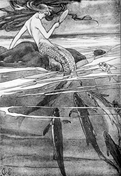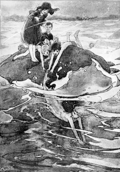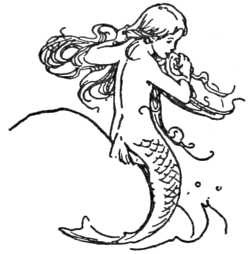 One fine summer evening Peter, with Wendy and their little family, went down to the Lagoon where the Mermaids lived. The Never-Never-Never Land, as you see, is full of the most strange and interesting creatures; some of them dreadful, like the Pirates, wolves, and crocodiles; others, like the fairies and the mermaids, altogether beautiful and charming. Wendy and her brothers, who had never seen a real mermaid with a tail, were very much excited, and, as luck would have it, just as they arrived at the lagoon, one of them, seated on a rock, was combing her long tresses, on which the sunlight gleamed, until they shone like a mixture of gold and bronze, for they had a beautiful greenish tinge. As she combed her hair she sang such a wonderful melody that the boys longed to catch her. They instantly dashed into the water, but with a piercing cry of "Mortals!" the Mermaid dived out of their reach into the lowest depths.