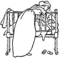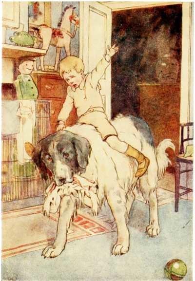 Nana got up, and stretched herself, and carefully switched on the electric light. You would have been surprised to see how cleverly she managed to do that with her mouth. Then she turned the bedclothes neatly down and hung the little pyjamas over the fire-guard. She then trotted up to the bathroom and turned on the water; after feeling it with her paw to make sure that it was not too hot, she went off to look for Michael, who, being the youngest of the three children, must go to bed first. She returned immediately with him sitting astride on her back as though she were a pony. Michael, of course, did not want to be bathed, but Nana was firm and, taking him to the bathroom, shut the door so that he should not be in a draught. Then Mrs. Darling came to peep at him as he splashed about in the nice warm water.