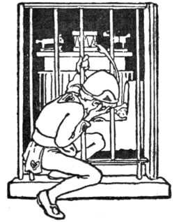 But, just as the Boys' fate seemed determined, something happened to change Hook's glee into terror. "Tick! tick! ter-ick, tick, tick!" he heard, and at the dreaded sound he yelled: "The crocodile! hide me, hide me!" In abject fear he rushed to a corner of the ship while his men crowded round him, intent only upon shielding their captain from the jaws of the monster. The Boys, too, waited breathless with horror, until with sudden relief and rapture they saw not the crocodile but their beloved captain Peter Pan appearing over the ship's side. In one hand, at arm's length, he held an alarum clock, the ticking of which had made Hook believe that the crocodile was upon him.