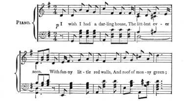 seen. With fun-ny lit-tle red walls, And roof of mos-sy green;
