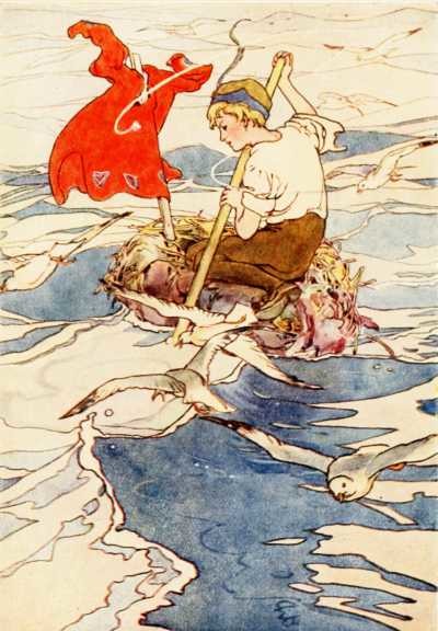 Then indeed, as the tide rose steadily, Peter was in great peril. The water reached his feet, and he was beginning to think it would be a "tremendous adventure to die," when who should come sailing by but a great sea-bird on its nest, which had been blown off the cliffs by the rising storm. "Hurrah!" cried Peter, "there's a lovely boat for me!" and chasing the bird off, in he stepped, curled himself round and, spreading out his coat to the wind, sailed swiftly and merrily after Wendy.