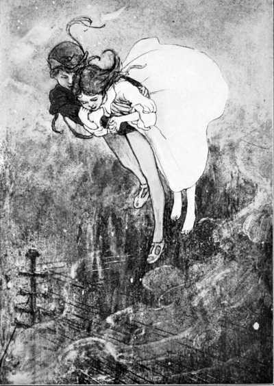 Peter, left alone on the rock with Wendy, found her so exhausted that she could neither swim nor fly any farther. With difficulty he managed to help her to a firm footing, but the tide was rising, and they were both in great danger. As he watched the water silently creeping nearer, Peter almost despaired. But all at once a large kite came flying slowly over the lagoon. In a second Peter had seized its tail and, binding it tightly round Wendy, he sent her sailing away in safety, bravely calling, "Good-bye Wendy!" until she was out of sight.
