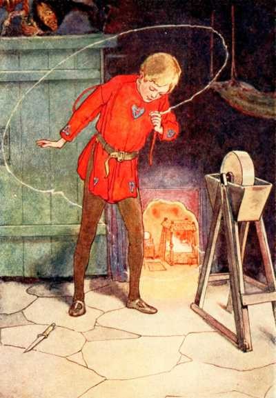 He got up and opened the door. Tinker Bell, tinkling excitedly, flew into the room. "The Pirates have captured them!" she tinkled, "the Pirates have captured them!" As Peter excitedly snatched up his sword and sharpened it very sharply on the grindstone, he perceived Tinker Bell in his glass of medicine. He soon learnt the reason, when his little fairy told him, in a weak voice, that it was poisoned, and that she had drunk the poison as the only way to save his life. It was indeed an act of self-sacrifice; for too well did Tink know how much Peter loved Wendy, and that no warning of hers would prevent him from keeping his promise.