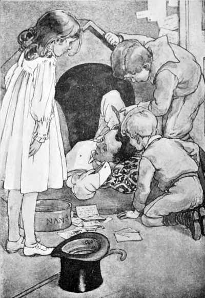 "Very well," said Mr. Darling, "we shall see who is the braver." Two glasses were fetched and filled in a moment. "One, two, three," cried Wendy; Michael took his like a man, but Mr. Darling only pretended to, and quietly hid the glass behind his back. John caught him in the act: "Father hasn't taken his!" he cried, and Michael, seeing that he had been tricked, burst into a loud "Boo-hoo-oo!" Mr. Darling, to appease Michael, thought of what seemed to him an excellent joke. He poured his medicine into Nana's drinking-bowl, and when poor Nana, thinking that it was something nice, ran eagerly to lap it up, he roared with laughter to see the reproachful eyes she turned upon him. The children, who loved their old nurse very dearly, were terribly distressed as she slunk to her kennel, looking as woeful and as hurt in her feelings as ever a dog did. Mr. Darling, angry that they did not enjoy his joke in the least, coaxed Nana out of her kennel, seized her by the collar and dragged her off in disgrace, to be chained up in the yard, "the proper place for dogs," he said, in spite of the persuasions and pleadings of them all. Mrs. Darling comforted the children, kissing them very tenderly as mothers always do, tucked them up in their beds, sang them to sleep and, leaving the night-lights burning for company, crept softly out of the room to go to the dinner-party with Mr. Darling.