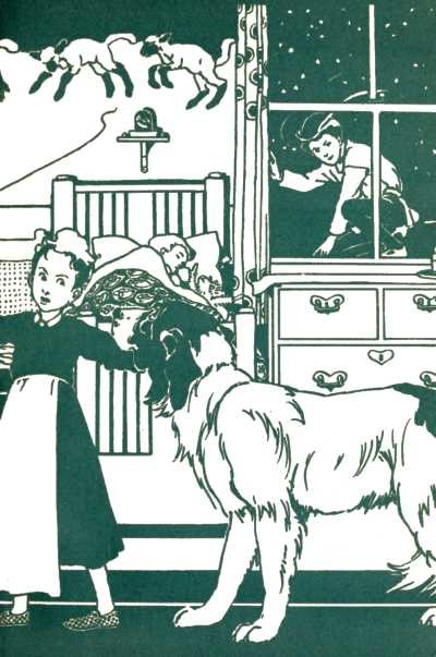 In one of the nicest nurseries in the world there were beds for three young people called John Napoleon, and Wendy Moira Angela, and Michael, the children of Mr. and Mrs. Darling. The nursery was wide and airy, with a large window, and a bright fire with a high fire-guard round it, and a big clock, and prettily-coloured nursery-rhyme pictures over the walls. It was in many ways a most interesting household. For one thing, although there was a pretty little parlour-maid called Liza, the children were bathed and dressed by a big dog called Nana, whose kennel was kept in the nursery.