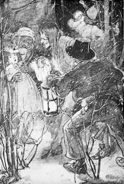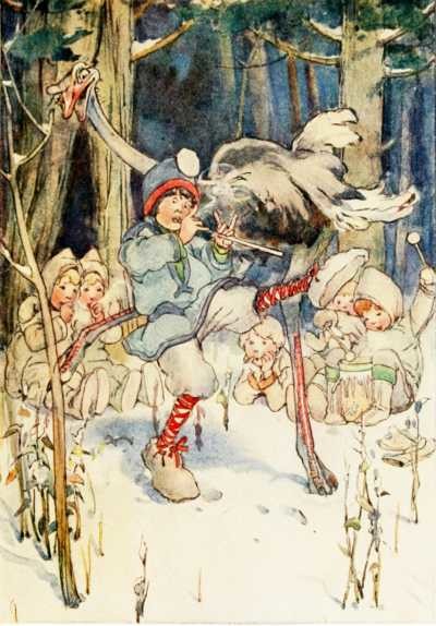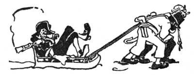 The Lost Boys, who, in their fur coats, looked more like bears than boys, were anxiously awaiting Peter's return. There were six of them: Slightly Soiled, the eldest; then came Tootles, and Nibs, and Curly, and the Twins, who were so much alike that one name did for both of them, so each was called Twin. They lived like moles under the ground, for fear of the Pirates and the wolves. Each one had a special staircase hollowed in a tree-trunk, so that they could easily run down among the roots of the trees into their home. They were playing about happily, although they were beginning to be a little anxious that Peter was so long away. Slightly was tootling on a whistle, and dancing quite merrily, with an ostrich for partner (a queer companion, you will say), when suddenly the gruff voices of the Pirates were heard. Nibs, who was very brave, slipped away through the trees to scout, but the others had only just time to scuttle down the stairs in the hollow trees before the big ugly buccaneers came tramping up, hauling their captain, who was sitting in state upon a sledge.