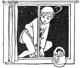 Whilst Mrs. Darling was in the nursery she heard a wee noise outside the window, as a tiny figure, no bigger than a little boy, tried the window-latch, and vanished suddenly at her cry of surprise. She flung the window open, but there was nothing to be seen, nothing but the dim roofs of the neighbouring houses, and the deep blue sky above. She began to frighten herself with eerie bogie tales, for the same thing had happened the day before, when Nana had gone to the window and shut it down so quickly that she had cut off the boy's shadow. Mrs. Darling had found it in Nana's mouth, and had carefully folded it and put it away. But she soon felt reassured when her children came in together in answer to her call. John Napoleon and Wendy were playing at their favourite game of being Father and Mother, and Mrs. Darling's beautiful face beamed with delight as she listened to them. Suddenly, in rushed Mr. Darling, very much excited because he could not fasten his evening tie (evening ties are difficult things to fasten, you know). Mrs. Darling easily managed that for him, and he was soon skipping about the room with Michael on his back, dropping him finally into his bed with a big "bump-ah!"——