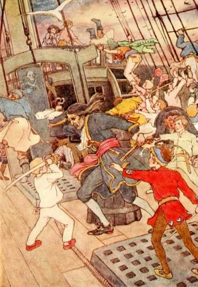 The Pirates were ready for them. As each child came above the ground, he was seized by one of the swarthy ruffians who stood waiting. One by one, and silently, they were captured and flung into boats and transported to the pirate ship, which had anchored in the lake close by.