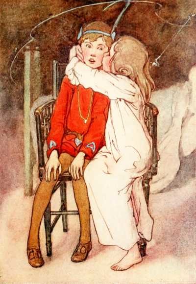 This was rather clever of Peter, and at these sensible words Wendy got up again. She even offered to give Peter a kiss if he liked. Peter looked puzzled, but seeing the thimble on Wendy's finger he thought she meant to give him that, and held out his hand for it. Now Wendy saw at a glance that the poor boy did not even know what a kiss was, but being a nice little girl of motherly disposition, she did not hurt his feelings by laughing at him, but simply placed the thimble on his finger.
