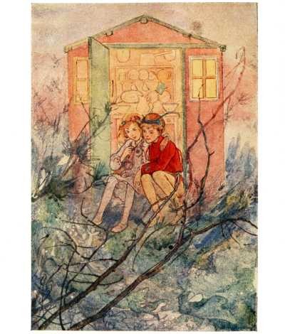 High in the tree tops of the Never-Never-Never Land, Tinker Bell placed the little house that was built for Wendy. The tree tops are soft as velvet, and in the evening at twilight are all bejewelled with tiny mauve, and white, and blue lights. The mauve ones are boy fairies, the white, girl fairies, and the blue lights are darling little sillies who are not quite sure what they are.