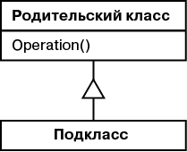 Новые классы могут определяться в контексте существующих с использованием наследованияклассов. Если подкласс наследует родительскомуклассу, то он включает определения всех данных и операций, определенных в родительском классе. Объекты, являющиеся экземплярами подкласса, будут содержать все данные, определенные как в самом подклассе, так и во всех его родительских классах. Такой объект сможет выполнять все операции, определенные в этом подклассе и его предках. Отношение «является подклассом» обозначается вертикальной линией с треугольником.