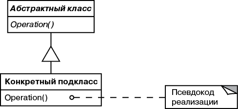 Имена абстрактных классов записываются курсивом, чтобы отличать их от конкретных. Курсив используется также для обозначения абстрактных операций. На диаграмме может изображаться псевдокод, описывающий реализацию операции; в таком случае код представлен в прямоугольнике с загнутым уголком, соединенном пунктирной линией с операцией, которую он реализует.