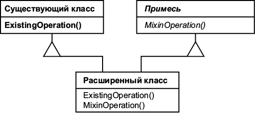 Примесью (mixin class) называется класс, назначение которого — предоставить дополнительный интерфейс или функциональность другим классам. Он отчасти похож на абстрактные классы в том смысле, что не предполагает непосредственного создания экземпляров. Для работы с примесями необходимо множественное наследование: