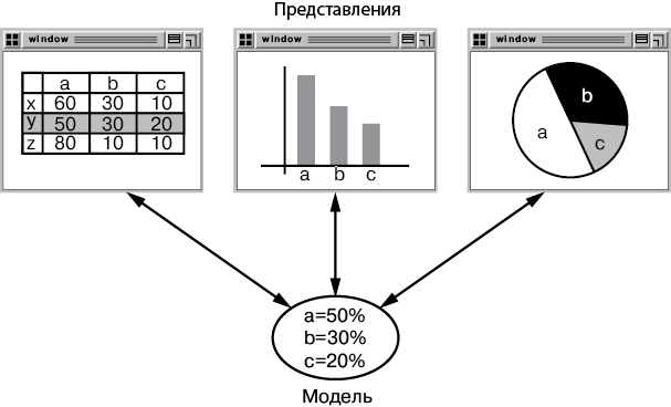 На следующей схеме показана одна модель и три представления. (Для простоты мы опустили контроллеры.) Модель содержит некоторые данные, которые могут быть представлены в форме электронной таблицы, гистограммы и круговой диаграммы. Модель сообщает своим представлениям обо всех изменениях значений данных, а представления взаимодействуют с моделью для получения новых значений.