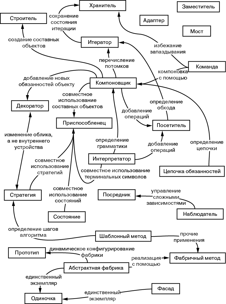Классифицировать паттерны можно и по их ссылкам (см. разделы «Родственные паттерны»). На рис. 1.1 такие отношения изображены графически.