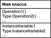 В нашей нотации, основанной на OMT (см. приложение Б), класс изображается прямоугольником, внутри которого жирным шрифтом написано имя класса. Ниже обычным шрифтом перечислены операции. Все данные, определенные для класса, следуют после операций. Имя класса, операции и данные разделяются горизонтальными линиями: