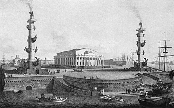 Тома де Томон использовал два сорта одного и того же финского гранита для облицовки подиума здания Биржи, внизу идут два ряда громадных облицовочных блоков розового гранита, а два верхних ряда – серого. Чтобы попытаться проникнуть в смысл такого художественного приема, надо подняться наверх и бросить взгляд на Ростральные колонны с самой верхней ступени широкого лестничного марша, ведущего к старому, уже давно забытому (и забитому) входу в Биржу. При взгляде отсюда в сторону Невы серый цвет гранита в верхних ступенях лестницы и в ее боковинах (тетивах) сливается с серым цветом гранита в постаментах Ростральных колонн.