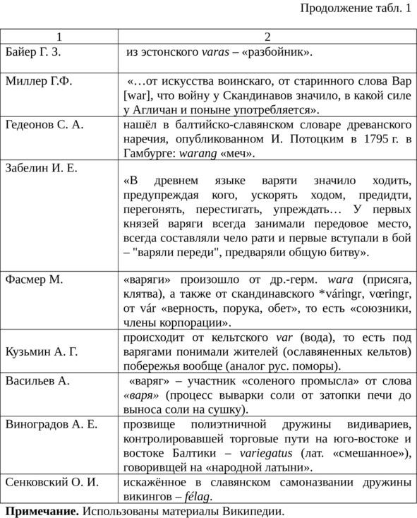 Но даже Словарь Фасмера не смог отразить все версии этимологии этнонима варяг. Мы попытались собрать существующие версии этимологии этнонима варяги (см. табл. 1), но, по всей видимости, с этой задачей также не справились.
