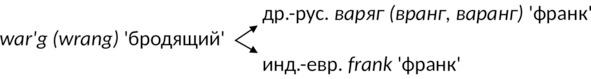 То есть др.-рус. варяг и инд.-евр. франк являются когнатами, родственными словами, происходящими от одной основы war’g (wrang) «бродящий», правда Брокгауз не указал ее языковую принадлежность, но мы не ошибемся, отнеся ее к индоевропейской.
