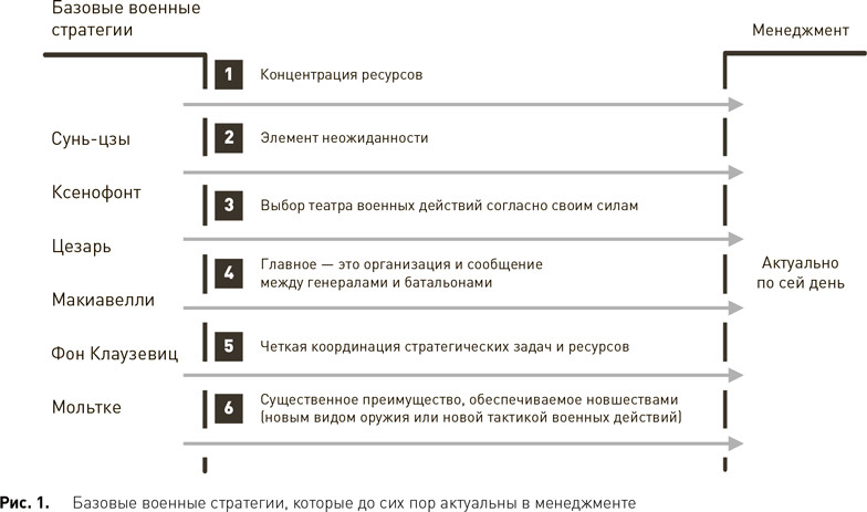 Понятие «стратегия» происходит от греческого слова «стратег», означающего «военачальник», и подразумевает планирование распределения ресурсов ради достижения определенных целей. Карл фон Клаузевиц (1780–1831), прусский генерал и теоретик военного дела, сказал: «Стратегия — это экономия силы», и именно поэтому его считают первым стратегом. Однако, если заглянуть вглубь веков, мы обнаружим, что многие полководцы разрабатывали и формулировали военную стратегию и до него — например, Цезарь, Сунь-цзы и Макиавелли (рис. 1). И все эти военные стратегии, самые древние из которых относятся к эпохе античности, до сих пор актуальны в менеджменте.