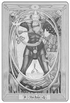 Перед нами демоническая фигура, окрашенная в зеленый цвет и окруженная четырьмя витками спирали (духовные уровни). На спирали видны различные символы. Зеленый Шут (Бахус, Дионис, Апрельский дурак) занимает почти все пространство карты. Носки его ступней указывают вверх — это говорит о том, что он лишен непосредственной связи с землей. При взгляде на карту сразу становится ясно, что поднятыми вверх распростертыми руками он подпирает небо (углы карты символизируют безграничное пространство). У него похотливое выражение лица, на голове — рога, между которыми мы видим кристаллический конус. Конус касается вершины пирамиды, окружающей Шута. Его безумный взгляд направлен в пространство (мы не можем посмотреть ему прямо в глаза, так как визуальная ось немного смещена). Правой рукой он держит перевернутую чашу, левой — горящий сосновый факел, искры от которого образуют светящуюся дугу над макушечной чакрой. Сочная кисть винограда свисает с его левого плеча. Под ней мы видим дождь из монет с астрологическими символами. Между ногами Шута изображен цветок необычной формы, а в центре фигуры, в точке накопления творческой, созидательной силы, находится солнце.